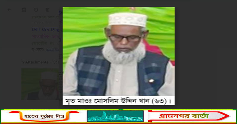 বগুড়ার আদমদীঘি উপজেলা সদরের আদমিয়া ফাযিল মাদ্রাসার অবসর প্রাপ্ত অধ্যক্ষ আলহাজ্ব মাওলানা মোসলিম উদ্দিন খান (৬৩) ইন্তেকাল করেছেন (ইন্নালিল্লাহি....রাজেউন)। গত বৃহস্পতিবার (২৫ ডিসেম্বর) রাত আনুমানিক ৮টায় নিজ বাসভবন আদমদীঘি উপজেলা সদরের গো-হাটি এলাকায় মৃত্যবরণ করেন। তিনি দীর্ঘ দিন প্যারালাইসিস সহ অন্যান্য জটিল রোগে ভুগছিলেন। তিনি পার্শ্ববর্তী দুপচাঁচিয়া উপজেলার কাথোহালী পানাপুকুর গ্রামের মৃত মল্লিক উদ্দীন খানের ছেলে। তিনি আদমদীঘি আদমিয়া ফাযিল মাদ্রাসায় ১৯৮৭ সন থেকে প্রথম প্রভাষক ও পরে অধ্যক্ষ হিসাবে দায়িত্ব পালন করতেন। মৃত্যুকালে তিনি স্ত্রী, ২ ছেলে ও ৩ মেয়ে নাতি-নাতনি সহ অসংখ্য গুণগ্রাহি রেখে যান। তাঁর মৃত্যুতে গভীর শোক ও শোকসন্তপ্ত পরিবারের গভীর সমবেদনা জানিয়েছেন, আদমদীঘি হাজী তাছের আহম্মদ মহিলা কলেজের অধ্যক্ষ মোস্তফা আহমেদ (নাইডু), আদমিয়া ফাযিল মাদ্রাসার ভাইস প্রিন্সিপাল আলহাজ মাওঃ আলী হাসান, নওগাঁ নামাজগড় মাদ্রাসার সহকারী অধ্যাপক আলহাজ্ব মাওঃ আবু বক্কর সিদ্দিক সহ মাদ্রাসার সকল শিক্ষক কর্মচারী ও শিক্ষার্থীবৃন্দ।