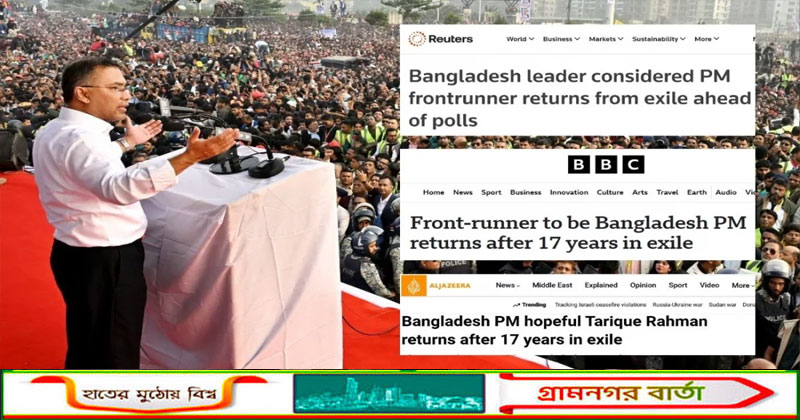 যুক্তরাজ্যের প্রভাশালী সংবাদমাধ্যম বিবিসির শিরোনাম—‘১৭ বছর নির্বাসনে থাকার পর দেশে ফিরেছেন বাংলাদেশের প্রধানমন্ত্রী পদপ্রার্থী’। খবরে বলা হয়েছে, ১৭ বছর নির্বাসনে থাকার পর জাতীয় সংসদ নির্বাচনের আগে দেশে ফিরেছেন বাংলাদেশের পরবর্তী প্রধানমন্ত্রী হওয়ার পথে এগিয়ে থাকা তারেক রহমান। তারেক রহমানের নেতৃত্বে আগামী বছর অনুষ্ঠেয় জাতীয় নির্বাচনে অংশ নেওয়ার মধ্য দিয়ে ক্ষমতায় ফিরতে চায় বিএনপি। ২০০৮ সাল থেকে লন্ডনে বসবাস করা তারেক রহমান দেশের নতুন নেতা হতে পারেন বলে মনে করা হচ্ছে।