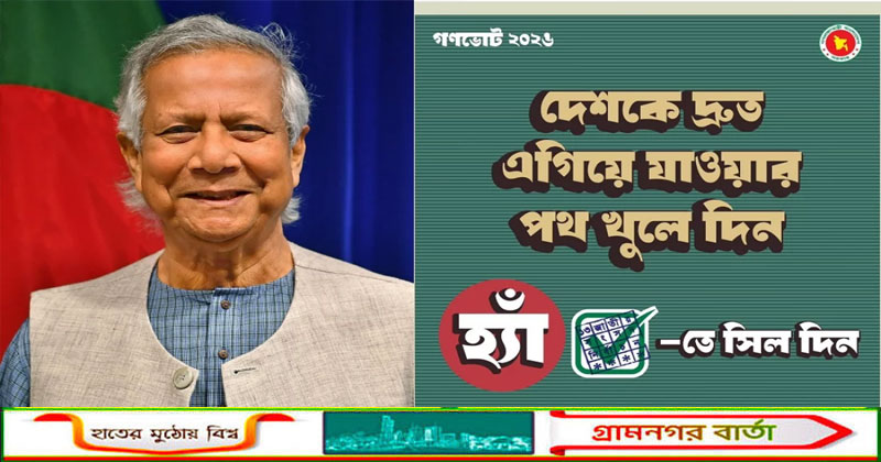 ফটোকার্ডে লেখা, ‘গণভোট ২০২৬- দেশকে দ্রুত এগিয়ে যাওয়ার পথ খুলে দিন ‘হ্যাঁ’তে সিল দিন।’প্রধান উপদেষ্টার প্রেস উইং থেকে বলা হয়, গণভোটের প্রচারণার অংশ হিসেবে ১১ জানুয়ারি থেকে চলমান ফটোকার্ড শেয়ার অব্যাহত রয়েছে। আগামীকাল রবিবার (১৮ জানুয়ারি) পর্যন্ত চলবে এ কার্যক্রম।