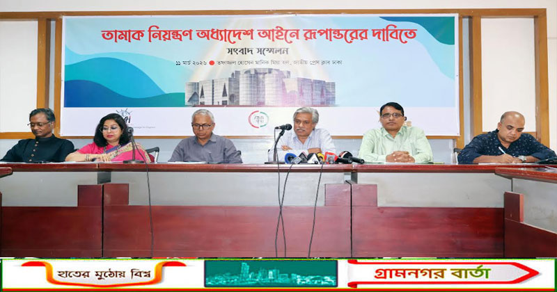 আজ বুধবার [১১ মার্চ) জাতীয় প্রেস ক্লাবের তফাজ্জল হোসেন মানিক মিয়া সভাকক্ষে আয়োজিত এক সংবাদ সম্মেলনে সংগঠন দুটি এ দাবি জানায়।সংবাদ সম্মেলনে জানানো হয়, তামাক ব্যবহারের কারণে বছরে প্রায় ২ লক্ষ মানুষ মৃত্যুবরণ করে। তামাক ব্যবহার ও উৎপাদনে স্বাস্থ্য এবং পরিবেশের ক্ষতি বছরে ৮৭ হাজার কোটি টাকা। তামাক খাত থেকে অর্জিত রাজস্বের চেয়ে এই ক্ষতি দ্বিগুণেরও বেশি। বর্তমানে ৩৫ শতাংশ প্রাপ্তবয়স্ক মানুষ তামাক ব্যবহার করছেন। এই পরিস্থিতিতে শক্তিশালী তামাক নিয়ন্ত্রণ আইন কার্যকর করা না হলে জনস্বাস্থ্য ও অর্থনীতির ওপর তামাকের ক্ষতিকর প্রভাব আরও বাড়তে থাকবে।