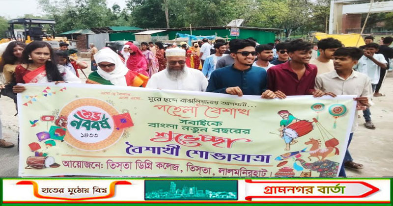 বর্ণাঢ্য আয়োজন ও উৎসবমুখর পরিবেশে তিস্তা ডিগ্রি কলেজে উদযাপিত হয়েছে বাংলা নববর্ষ। নববর্ষ উপলক্ষে মঙ্গলবার ভোর থেকেই শহরে শুরু হয় নানা আয়োজন। কলেজ প্রশাসনের আয়োজনে বাংলা নববর্ষকে স্বাগত জানিয়ে বের হয় বর্ণাঢ্য বৈশাখী শোভাযাত্রা। শোভাযাত্রাটি শহরের গুরুত্বপ‚র্ণ সড়ক প্রদক্ষিণ করে কলেজ মাঠে গিয়ে শেষ হয়।