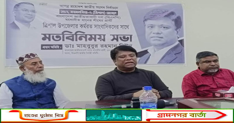 মতবিনিময় সভায় সাংবাদিকদের বিভিন্ন প্রশ্নের জবাব দেন ময়মনসিংহ-৭ (ত্রিশাল) আসনের বিএনপি মনোনীত ধানের শীষ প্রতীকের এমপি প্রার্থী ডা. মাহবুবুর রহমান লিটন। তিনি বলেন, ‘এ এলাকায় অনেক সমস্যা রয়েছে। আমরা নির্বাচিত হলে এসব সমস্যার সমাধানে কাজ করব। এ জনপদের সমস্যা সমাধানে আমাদের বৃহৎ পরিকল্পনা রয়েছে।’