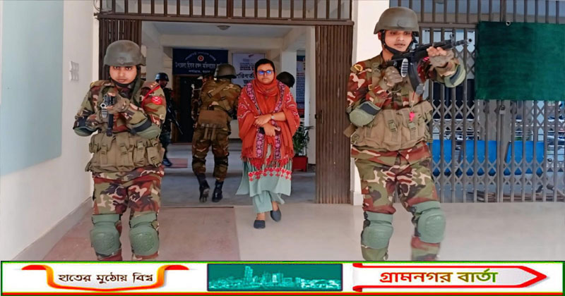 বগুড়ার নন্দীগ্রামে উপজেলা নির্বাহী কর্মকর্তা (ইউএনও) শারমিন আরাকে তার নিজ কার্যালয়ে ঢুকে দুর্বৃত্তরা জিম্মি করেছে এমন এক চাঞ্চল্যকর পরিস্থিতির সৃষ্টি হয় বৃহস্পতিবার দুপুরে। এ খবর ছড়িয়ে পড়তেই মুহূর্তের মধ্যে থমথমে হয়ে ওঠে উপজেলা পরিষদ চত্বর। খবর পেয়ে দ্রুত ঘটনাস্থলে ছুটে আসে সেনাবাহিনীর ২৪ বীর নন্দীগ্রাম ক্যাম্পের চৌকস একটি টিম। এরপর চারিদিকে ঘিরে ফেলে কৌশলগত অবস্থান নেয় তারা। শুরু হয় সাইরেন বাজানো, দৌড়ঝাঁপ ও অস্ত্রধারী সেনাবাহিনীর সদস্যদের তৎপরতা। পরে কমান্ডো কায়দায় অভিযান চালিয়ে দুর্বৃত্তদের আটক এবং উপজেলা নির্বাহী কর্মকর্তা শারমিন আরাকে অক্ষত অবস্থায় উদ্ধার করা হয়। কিছুক্ষণ পর জানা যায়, পুরো ঘটনাটি বাস্তব নয়। আগামী ১২ ফেব্রুয়ারি অনুষ্ঠিতব্য ত্রয়োদশ জাতীয় সংসদ নির্বাচনকে সামনে রেখে আইনশৃঙ্খলা পরিস্থিতি স্বাভাবিক রাখতে সেনাবাহিনীর একটি পরিকল্পিত মহড়ার অংশ ছিলো এই দৃশ্য।