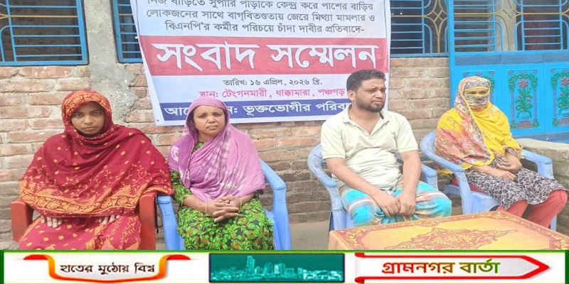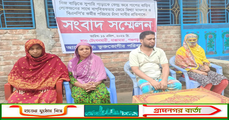 পঞ্চগড়ের সদর উপজেলায় তুচ্ছ ঘটনাকে কেন্দ্র করে ঝগড়াঝাটি ও পরে বিষয়টি মিমাংসা করতে বিএনপি নেতাকে চাঁদা না দেওয়ায় মামলা দায়ের ও হয়রানি করার অভিযোগ উঠেছে সাবুল হোসেন নামে এক বিএনপি নেতা ও তারই স্বজন মখলেছ, রুপালিদের বিরুদ্ধে। বৃহস্পতিবার দুপুরে উপজেলার ধাক্কামারা ইউনিয়নের টেংগনমারী এলাকায় সংবাদ সম্মেলন করে এই অভিযোগ করেন ভূক্তভোগী পরিবারের সদস্য ও মামলার প্রধান আসামীর দ্বিতীয় ছেলে মাহমুদুর রহমান।