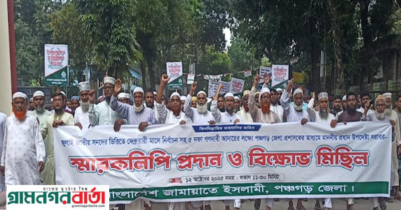 জুলাই জাতীয় সনদের ভিত্তিতে ফেব্রুয়ারি মাসে জাতীয় সংসদ নির্বাচন সহ পাঁচ দফা সহ গণদাবি আদায়ের লক্ষ্যে দাবিতে বিক্ষোভ মিছিল ও প্রধান উপদেষ্টা বরাবরে জেলা প্রশাসকের মাধ্যমে স্মারকলিপি প্রদান করেছে পঞ্চগড় জেলা জামায়াতে ইসলামী। রবিবার দুপুরে জেলা জামায়াতে ইসলামীর আয়োজনে জেলা শহরের চৌরঙ্গী মোড় এলাকা থেকে একটি বিক্ষোভ মিছিল বের করা হয়। মিছিলটি শহরের প্রধান সড়ক প্রদক্ষিণ করে জেলা প্রশাসকের কার্যালয় চত্বর গিয়ে শেষ হয়।