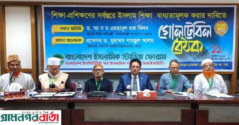 ১১ই অক্টোবর ২০২৫, শনিবার সকালে জাতীয় প্রেসক্লাবের তোফাজ্জল হোসেন মানিক মিয়া হলে সংকট আবর্তে ইসলাম শিক্ষা: উত্তরণ কর্মকৌশল বিষয় ইসলামিক স্টাডিজ ফোরামের উদ্যোগে গোল টেবিল বৈঠক প্রফেসর মোঃ ছানা উল্লাহর সভাপতিত্বে ড. আবদুল আজিজের ও উপাধ্যক্ষ মোঃ আবদুর রহমানের সঞ্চালনায় অনুষ্ঠিত হয়। উক্ত সভায় প্রধান অতিথি হিসেবে উপস্থিত ছিলেন সাবেক শিক্ষা প্রতিমন্ত্রি ড. আ ন ম এহসানুল হক মিলন। প্রধান আলোচক হিসেবে আলোচনা করেন আরবি ইসলামি বিশ্ববিদ্যালয়ের উপাচার্য প্রফেসর ড. মুহাম্মদ শামসুল আলম। উক্ত গোল টেবিল বৈঠকে উপস্থিত ছিলেন, প্রফেসর ড. এ কে এম ওয়ারেসুল করিম বুলবুল, প্রফেসর ড. আবু জাফর খান, প্রফেসর মিয়া মুহাম্মদ নুরুল হক, প্রফেসর ড. মোঃ রইছ উদ্দিন, প্রফেসর ড. আ ব ম ছিদ্দিকুর রহমান আশরাফী, প্রফেসর ড. শাহ মুহাম্মদ আবদুর রাহীম, প্রফেসর ড. আবদুল মান্নান, প্রফেসর আতিকুর রহমান, প্রফেসর মারুফুর রহমান শেখ, প্রফেসর রফিকুল ইসলাম, প্রফেসর আব্দুল কাদের মিয়া, প্রফেসর ড. মোঃ সাইদুল হক, এ এস এম জাফর সাদিক, মোঃ শহিদুল ইসলাম, প্রফেসর মাহবুব, মুফতী মহিবুল্লাহ, ড. হেদায়েত উল্লাহ, মোঃ মনিরুল হাসান প্রমুখ। বক্তাগণ বলেন, বাংলাদেশ একটি ধর্মপ্রাণ মানুষের দেশ। এই দেশের রাষ্ট্রধর্ম ইসলাম। সংখ্যা গরিষ্ঠ মুসলিম নাগরিকের ধর্ম ইসলাম। অন্যান্য ধর্মের নাগরিকগণও ধর্মপ্রাণ। কিন্তু রাষ্ট্রের নাগরিক ও নতুন প্রজন্মের জন্য জাতীয় শিক্ষা নীতি ও ব্যবস্থায় শিক্ষার কোনো স্তরেই “ইসলাম ও নৈতিক শিক্ষা” গুরুত্ব ও আবশ্যিক ভাবে পঠন পাঠনের ব্যবস্থা নেই। নাগরিক গণ ধর্মশিক্ষা নানা সোর্স থেকে শেখে। ফলে অশিক্ষা কুশিক্ষা কুসংস্কারে আচ্ছন্ন হয়ে ধর্মান্ধতা ও উগ্রতার উন্মেষ ঘটে। বৃহত্তর জনগোষ্ঠী ধর্ম ও নৈতিকতায় অজ্ঞ থেকে সমাজ এবং রাষ্ট্রের সর্বক্ষেত্রে অনৈতিকতা ও অবক্ষয়ের ছয়লাব ঘটায়। এই নৈতিক অবক্ষয় রোধ এবং ধর্মীয় নৈতিক সমাজ ও রাষ্ট্র পরিগঠন ও নৈতিকতায় উজ্জীবিত করতে ও রাখতে শিক্ষা ও প্রশিক্ষণের সর্বস্তরে ধর্মীয় নৈতিক শিক্ষা আবশ্যিকভাবেই কারিকুলাম ও সিলেবাসে অন্তর্ভুক্ত রাখতে হবে। বক্তাগণ আরো বলেন, ২০২৫-২৬ শিক্ষাবর্ষে উচ্চমাধ্যমিক পর্যায়ে ভর্তি নীতিমালায় “ইসলাম শিক্ষা” বিষয়টি এবারও ঐচ্ছিক ৪র্থ বিষয় হিসেবে রাখা হয়েছে বলে উল্লেখ করেন। যা বিগত পতিত সেক্যুলার ফেসিস্টদেরই পুনরাবৃত্তি এবং জুলাই বিপ্লবের শহীদের রক্তের সাথে বেইমানি। ইসলাম প্রিয় দেশবাসি, অভিভাবক ও শিক্ষার্থীদের প্রাণের দাবি উচ্চমাধ্যমিক পর্যায়ে মানবিক, বিজ্ঞান ও ব্যবসায় শিক্ষা শাখা ও বিভাগে “ইসলাম শিক্ষা” বিষয়টি আবশ্যিক হিসেবে অধ্যয়নের ব্যবস্থা করার দাবি জানান অথবা ২০১২ সালের পূর্বের অবস্থায় ফিরিয়