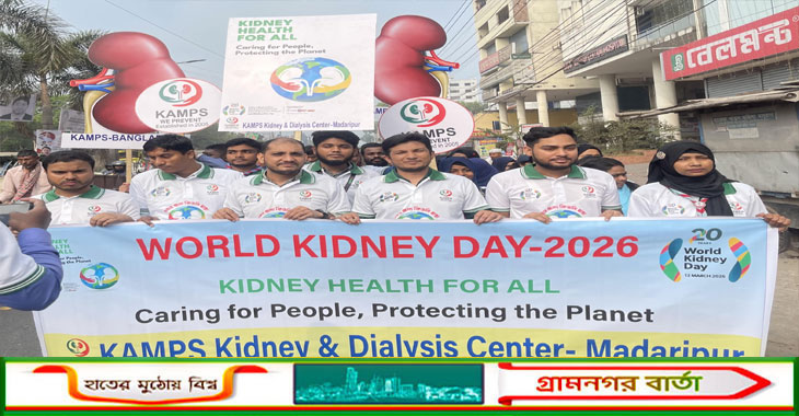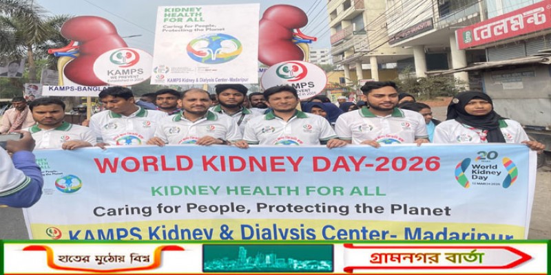 “সবার জন্য কিডনি স্বাস্থ্য - মানুষের সেবায় ধরনী রক্ষায় ” এ শ্লোগানকে সামনে রেখে মাদারীপুরে বিশ্ব কিডনি দিবস-২০২৬ পালিত হয়েছে। এ উপলক্ষ্যে বৃহস্পতিবার (১২ মার্চ) দিনব্যাপি কর্মসূচী পালন করে কিডনি বিষয়ক বেসরকারী স্বেচ্ছাসেবী সংস্থা কিডনি এওয়ারনেস মনিটরিং এন্ড প্রিভেনশন সোসাইটি (ক্যাম্পস)।