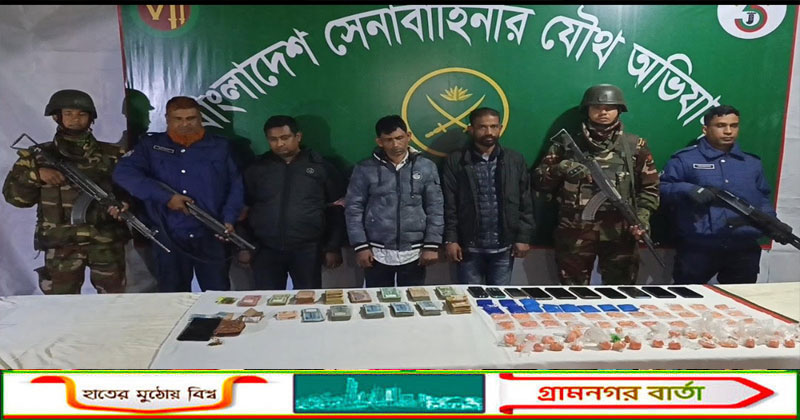 মাদারীপুরে সেনাবাহিনীর নেতৃত্বে পরিচালিত এক বিশেষ মাদকবিরোধী যৌথ অভিযানে বিপুল পরিমাণ ইয়াবা, গাঁজা, দেশীয় অস্ত্র ও নগদ টাকাসহ তিনজন মাদক কারবারিকে গ্রেফতার করা হয়েছে।সোমবার (২০ জানুয়ারি) গোপন গোয়েন্দা সংবাদের ভিত্তিতে মাদারীপুর পৌরসভার চরমুগরীয়া চরখাগদি এলাকার তালুকদার বাড়িতে এ অভিযান পরিচালনা করা হয়। অভিযানের নেতৃত্ব দেন ক্যাপ্টেন শাফিন সরোয়ার, ৩৫ বীর (সা: ব্যাটা:) ও লেফটেন্যান্ট রাশেদ। অভিযানে মাদারীপুর সদর আর্মি ক্যাম্পের একটি টহল দল অংশ নেয়।