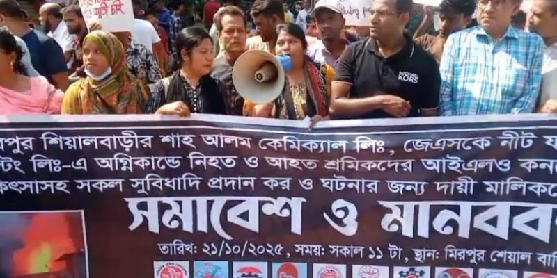 সমাবেশে বক্তারা বলেন, “১৪ অক্টোবর ঢাকার মিরপুরের রাসায়নিক কারখানায় ভয়াবহ অগ্নিকাণ্ড ঘটেছে। এতে অন্তত ১৬ শ্রমিক প্রাণ হারিয়েছেন, আর অসংখ্য শ্রমিক দগ্ধ হয়ে হাসপাতালে চিকিৎসাধীন। এই ঘটনা আমাদের সকলের হৃদয় ঝাঁপিয়ে তুলেছে এবং দেশের শিল্পখাতের নিরাপত্তা ব্যবস্থার দিক দিয়ে একটি দিকনির্দেশক সতর্কবার্তা হিসেবে কাজ করছে। আগুন দ্রুত ছড়িয়ে পড়ার পেছনে মূল কারণগুলো স্পষ্ট--নিরাপত্তাহীন ভবন, অবৈধভাবে রাখা রাসায়নিক গুদাম, এবং অকার্যকর অগ্নিনির্বাপণ ব্যবস্থা।