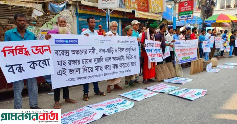 রাজশাহীতে চায়না দুয়ারি জাল দিয়ে মাছ ধরা বন্ধের দাবিতে মানববন্ধন