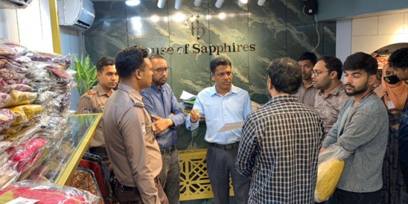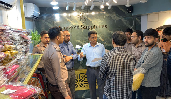 পাকিস্তানি পোশাক বলে মিথ্যা প্রচারণা এবং প্রাইস ট্যাগে কাটাকাটি করার অভিযোগে রাজশাহীর একটি পোশাকের শোরুমে অভিযান পরিচালনা করেছে জাতীয় ভোক্তা অধিকার সংরক্ষণ অধিদপ্তর। রোববার দুপুর ১২টায় রাজশাহীর সপুরা বিসিক শিল্পনগরীতে অবস্থিত ‘হাউজ অব শিপিয়ারর্স’ নামের শোরুমে এ অভিযান চালানো হয়। এ সময় আমদানির সঠিক তথ্য প্রদর্শন না করা এবং মূল্য তালিকায় বারবার কাটাকাটি করে বেশি দামে পণ্য বিক্রির প্রমাণ পাওয়ায় প্রতিষ্ঠানটিকে ১০ হাজার টাকা জরিমানা করা হয়। অভিযান পরিচালনা করেন জাতীয় ভোক্তা অধিকার সংরক্ষণ অধিদপ্তরের রাজশাহী বিভাগের উপপরিচালক মো. ইব্রাহীম। অভিযান শেষে তিনি জানান, পাকিস্তানি পোশাক না থাকলেও প্রতিষ্ঠানটি মিথ্যা প্রচারণা চালাচ্ছিল। ভোক্তাদের সঙ্গে প্রতারণার অভিযোগে সতর্কতামূলকভাবে ১০ হাজার টাকা জরিমানা করা হয়েছে। ভোক্তাদের স্বার্থ রক্ষায় এ ধরনের অভিযান ভবিষ্যতেও অব্যাহত থাকবে বলেও জানান তিনি।