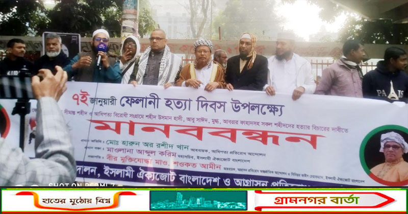 আধিপত্য প্রতিরোধ আন্দোলন, ইসলামী ঐক্যজোট বাংলাদেশ ও আগ্রাসন প্রতিরোধ আন্তর্জাতিক আন্দোলনের যৌথ উদ্যোগে "৭ই জানুয়ারি ফেলানী হত্যা দিবস" উপলক্ষে ৭ই জানুয়ারি, ২০২৬, বুধবার সকাল ১১টায় জাতীয় প্রেসক্লাবের সামনে “শহীদ ফেলানীসহ সকল সীমান্ত হত্যা ও আধিপত্যবাদী হত্যার বিচারের দাবীতে মানববন্ধন” অনুষ্ঠিত হয়।
