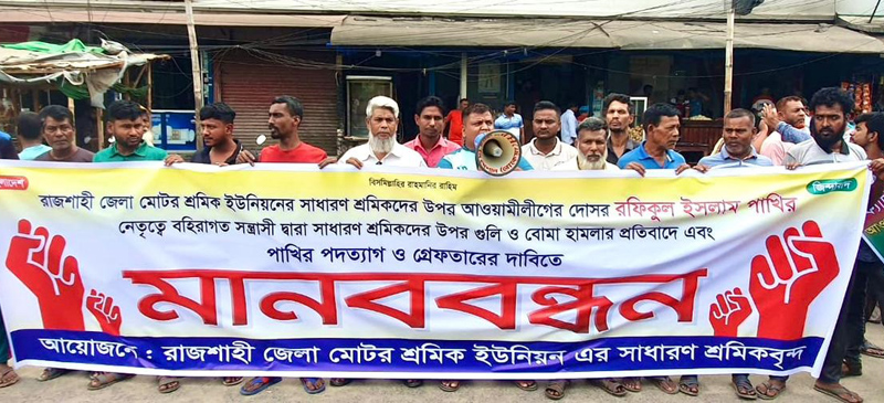 রাজশাহীতে মোটর শ্রমিকদের ওপর সন্ত্রাসী হামলার প্রতিবাদে মানববন্ধন করেছেন সাধারণ শ্রমিকরা। এ সময় অভিযুক্ত শ্রমিক নেতা রফিকুল ইসলাম পাখির পদত্যাগ ও গ্রেপ্তারের দাবি জানানো হয়। পাশাপাশি মোটর শ্রমিক ইউনিয়নের দ্রæত নির্বাচন আয়োজনের দাবিও তোলা হয়।