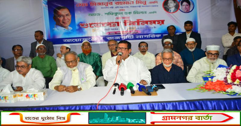 ভূমি মন্ত্রী মিজানুর রহমান মিনু বলেছেন, জনগণের প্রত্যাশা অনুযায়ী সবার সম্মিলিত প্রচেষ্টায় রাজশাহীর উন্নয়ন করা হবে। এখানে জনগণসহ বিএনপির নির্বাচিত চারজন সংসদ সদস্যকে নিয়ে এই উন্নয়ন পরিকল্পনা গ্রহন করা হবে বলে জানান তিনি। আর এই শান্তিপূর্ণ অবস্থানে ফিরে আসতে যারাই বাধা দিবে তাদের বিরুদ্ধে উপযুক্ত আইন অনুযায়ী ব্যবস্থার মধ্য দিয়ে শান্তি সুনিশ্চিত করা হবে। শনিবার দুপুরে রাজশাহী মহানগরীর সাহেব বাজারে অবস্থিত একটি কমিউনিটি সেন্টারের সম্মেলন কক্ষে রাজশাহী নাগরিক কমিটি আয়োজিত শুভেচ্ছা বিনিময় অনুষ্ঠানে প্রধান অতিথির বক্তব্য এসব কথা বলেন তিনি। মন্ত্রী আরো বলেন, আপনারা জানেন যে, এই মন্ত্রনালয়ের সঙ্গে প্রায় ১৬ টি প্রতিষ্ঠান জড়িত। সবগুলোকে সমন্বিতভাবে নিয়ে এসে তিনি এখানকার সন্তান হিসেবে রাজশাহী তথা দেশবাসীর উন্নয়নে কাজ করবেন। সেইসাথে রাজশাহী মহানগরীকে সুন্দর নগরী হিসেবে গড়ে তোলা হবে উল্লেখ করেন তিনি। তিনি বলেন, বিএনপির আমলে রাজশাহীতে গ্যাস লাইন স্থাপন ও চালু করা হয়। আবারও গ্যাস সংযোগের ব্যবস্থা করা হবে। সেইসাথে রুগ্ন শিল্প প্রতিষ্ঠানগুলো সচল করার পরিকল্পনা রয়েছে বলে জানান তিনি। রাজশাহী নাগরিক কমিটির আহবায়ক প্রফেসর এম রফিকুল ইসলামের সভাপতিত্বে বিশেষ অতিথির বক্তব্য রাখেন, রাজশাহী-৩ আসনের এমপি এডভোকেট. শফিকুল হক মিলন,মহানগর বিএনপির সাবেক আহবায়ক এডভোকেট এরশাদ আলী ঈশা, রাজশাহী বারের সভাপতি এডভোকেট আবুল কাশেম, ডা. ওয়াসিম হোসেন, এডভোকেট এনামুল হক, এডভোকেট আলী আশরাফ মাসুম, রাজশাহী মহানগর বিএনপির সহ-সভাপতি আসলাম সরকার, এডভোকেট পারভেজ তৌফিক জাহেদি, এডভোকেট জমসেদ আলী, প্রফেসর ড. হাবিবুর রহমান ও প্রফেসর ড. ফৌজিয়া প্রমুখ। অনুষ্ঠানটি সঞ্চালনা করেন রাজশাহী নাগরিক কমিটির সদস্য সচিব প্রফেসর আক্তার হোসেন প্রমুখ উপস্থিত ছিলেন।