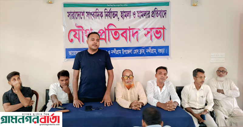 সারাদেশে সাংবাদিক নির্যাতন, হামলা ও মিথ্যা মামলার প্রতিবাদে নন্দীগ্রাম প্রেস ক্লাব ও নন্দীগ্রাম উপজেলা প্রেস ক্লাবের উদ্যোগে যৌথ প্রতিবাদ সভা অনুষ্ঠিত হয়েছে। সোমবার (২৯ সেপ্টেম্বর) বিকেলে নন্দীগ্রাম মডেল সরকারি প্রাথমিক বিদ্যালয় কক্ষে নন্দীগ্রাম উপজেলা প্রেস ক্লাবের সভাপতি ফজলুর রহমানের সভাপতিত্বে ও নন্দীগ্রাম প্রেস ক্লাবের সাধারণ সম্পাদক মনিরুজ্জামানের সঞ্চালনায় এ সভা অনুষ্ঠিত হয়।