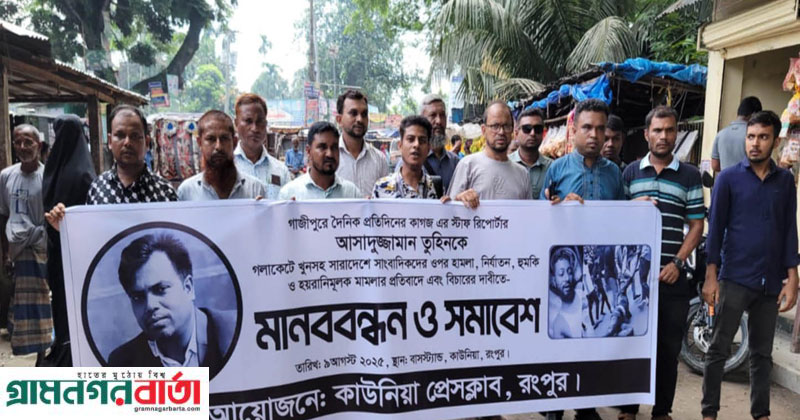 ঢাকার গাজীপুরে সাংবাদিক আসাদুজ্জামান তুহিন হত্যাকান্ড ও আনোয়ার হোসেন কে মারপিট করে গুরুত্বর আহত করা সহ সারাদেশে সাংবাদিকদের উপর হামলা, নির্যাতন, হুমকি, হয়রানি মূলক মামলা এবং হত্যাকান্ডে জড়িত দোষীদের বিচারের দাবীতে মানববন্ধন ও সমাবেশ করেছে কাউনিয়া প্রেসক্লাবের সাংবাদিক বৃন্দ।