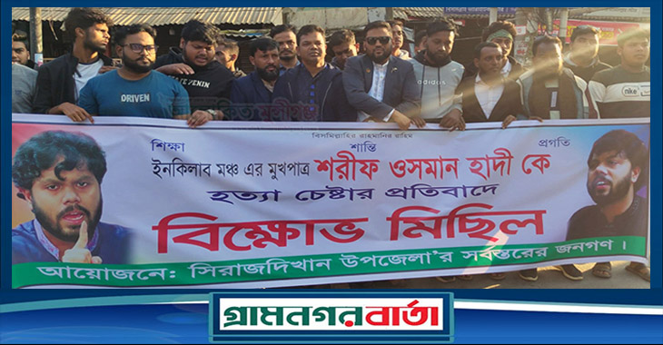 ইনকিলাব মঞ্চের মুখপাত্র শরীফ ওসমান হাদীর ওপর হত্যাচেষ্টার ঘটনার প্রতিবাদে মুন্সীগঞ্জের সিরাজদিখানে জাতীয় নাগরিক পার্টি (এনসিপি) ও সহযোগী সংগঠনের উদ্যোগে মানববন্ধন ও বিক্ষোভ মিছিল অনুষ্ঠিত হয়েছে। শনিবার বিকাল সাড়ে ৪টায় সিরাজদিখান উপজেলার মোড় এলাকায় এ মানববন্ধন শুরু হয়। পরে বিক্ষোভ মিছিলটি উপজেলার মোড় থেকে বিভিন্ন সড়ক প্রদক্ষিণ করে সিরাজদিখান উচ্চ বিদ্যালয়ের সামনে গিয়ে শেষ হয়।