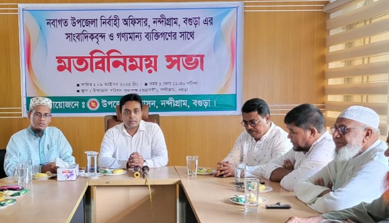 বগুড়ার নন্দীগ্রামে নবাগত উপজেলা নির্বাহী কর্মকর্তা আরিফুল ইসলাম নন্দীগ্রামের কর্মরত সাংবাদিকবৃন্দ ও গণ্যমান্য ব্যক্তিগণের সাথে মতবিনিময় সভা করেছেন। বৃহস্পতিবার (৯ অক্টোবর) দুপুরে উপজেলা পরিষদ সভাকক্ষে নবাগত উপজেলা নির্বাহী কর্মকর্তা আরিফুল ইসলামের সভাপতিত্বে ও উপজেলা কৃষি কর্মকর্তা গাজীউল হকের সঞ্চালনায় এ মতবিনিময় সভা অনুষ্ঠিত হয়।