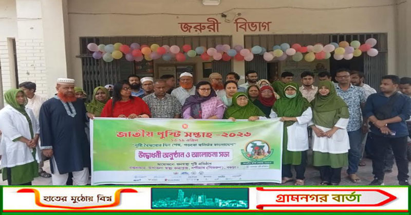 'পুষ্টি বৈষম্যের দিন শেষ, গড়বো স্বনির্ভর বাংলাদেশ' এই প্রতিপাদ্যে বগুড়ার নন্দীগ্রামে নানা আয়োজনে জাতীয় পুষ্টি সপ্তাহ উদ্বোধন করা হয়েছে। বৃহস্পতিবার [২৩ এপ্রিল) বেলা ১১টায় উপজেলা স্বাস্থ্য কমপ্লেক্স [বিজরুল) চত্বরে জাতীয় পুষ্টি সপ্তাহ উদ্বোধন করেন উপজেলা নির্বাহী কর্মকর্তা শারমিন আরা। এরপর সেখান থেকে একটি র্যালি বের হয়। র্যালিটি বিজরুল বাজার রাস্তা প্রদক্ষিণ করে। পরে উপজেলা স্বাস্থ্য কমপ্লেক্সের সভাকক্ষে উপজেলা নির্বাহী কর্মকর্তা শারমিন আরার সভাপতিত্বে ও মেডিকেল অফিসার ডা. আবু নাঈমের সঞ্চালনায় আলোচনা সভা অনুষ্ঠিত হয়।