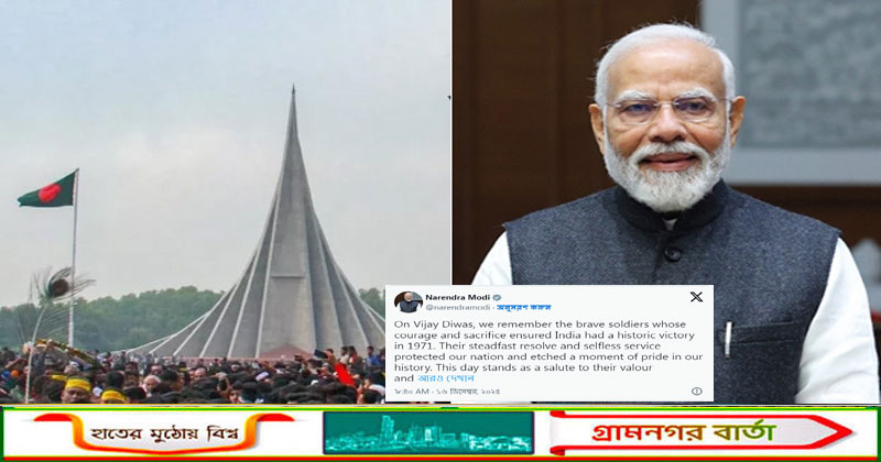 মোদীর পোস্টে লেখা হয়, বিজয় দিবসে আমরা আমাদের সেই সাহসী সেনাদের স্মরণ করছি, যাদের সাহসিকতা ও আত্মত্যাগ ১৯৭১ সালে ভারতের এক ঐতিহাসিক বিজয় নিশ্চিত করেছিল। তাদের দৃঢ় মনোবল ও নিঃস্বার্থ সেবা আমাদের দেশকে রক্ষা করেছে এবং আমাদের ইতিহাসে একটি গৌরবান্বিত মুহূর্ত খোদাই করেছে। এই দিনটি তাদের সাহসকে সম্মান জানায় ও তাদের অসাধারণ মনোবলকে মনে করিয়ে দেয়। সেনাদের এই বীরত্ব ভারতের বহু প্রজন্মকে অনুপ্রাণিত করে চলেছে।