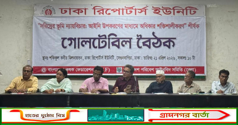 বাংলাদেশ কৃষক ফেডারেশন (BKF) এবং বাংলাদেশ পরিবেশ আইনবিদ সমিতি (বেলা)-এর যৌথ উদ্যোগে ২১ এপ্রিল ২০২৬, সকাল ১০টায় ঢাকা রিপোর্টারস ইউনিটির শফিকুল কবির মিলনায়তনে “দরিদ্রের ভূমি ন্যায়বিচার: আইনি উপকরণের মাধ্যমে অধিকার শক্তিশালীকরণ” শীর্ষক একটি গুরুত্বপূর্ণ গোলটেবিল বৈঠক অনুষ্ঠিত হয়।