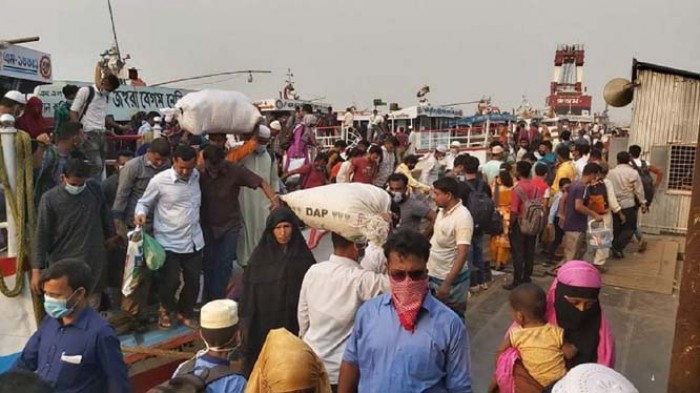 সুত্রে জানা যায়, সোমবার সরকার লকডাউন ঘোষনা করার পর রবিবার সকাল থেকেই শিমুলিয়া-বাংলাবাজার রুটে যাত্রী ও যানবাহনের চাপ বাড়তে থাকে। শিমুলিয়া থেকে এ চাপ আরো বেশি ছিল। দুপুরের পর ভীড় উপচেপড়ায় রুপ নেয়। বাড়তি ভাড়া গুনতে হচ্ছে প্রতিটি যানবাহন ও নৌযানেই। বাড়তি ভাড়া নির্ধারনের ফলে লঞ্চে যাত্রী প্রতি ভাড়া নেয়া হয় ৫৫ টাকা ও স্পীডবোটে ভাড়া নেয়া হয় ২শ টাকা করে। তারপরও আগের চেয়ে বেশি যাত্রী যানবাহন ও নৌযানগুলোতে। ফলে করোনার সংক্রমনের হার বেড়ে গেল কয়েকগুন। এনিয়ে যাত্রীদের মাঝে তীব্র ক্ষোভ পরিলক্ষিত হয়।এদিকে উভয় ঘাটেই যানবাহনের দীর্ঘ লাইন দেখা দিয়েছে। প্রতিটি যানবাহনকে দীর্ঘসময় ঘাটে আটকে থেকে পদ্মা নদী পাড়ি দিতে হচ্ছে।